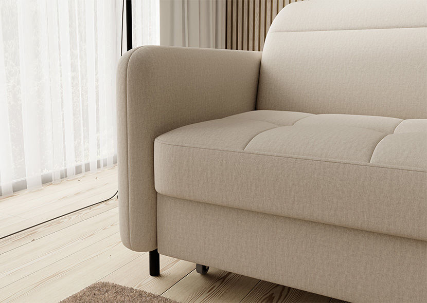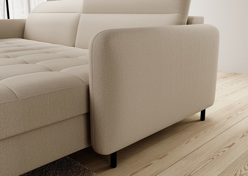 Pozornost je treba nameniti tudi polnilu sedeža: visoko elastična HR pena in valovita vzmet tipa B, dopolnjena s puhasto netkano tkanino, dajeta celoti nepozabno mehkobo in elastičnost. Zato se čez dan usedite na svoj kotni kavč in hitro boste začutili, kako Gomsi nežno obdaja vaše telo. Pravilno podprte mišice in hrbet se bodo hitro začeli sproščati, zaradi česar bo napetost, nakopičena čez dan, končno šla v pozabo. Nastavljivi vzglavniki bodo še bolj poglobili blaženost. Navsezadnje jih lahko preprosto prilagodite svojim željam!