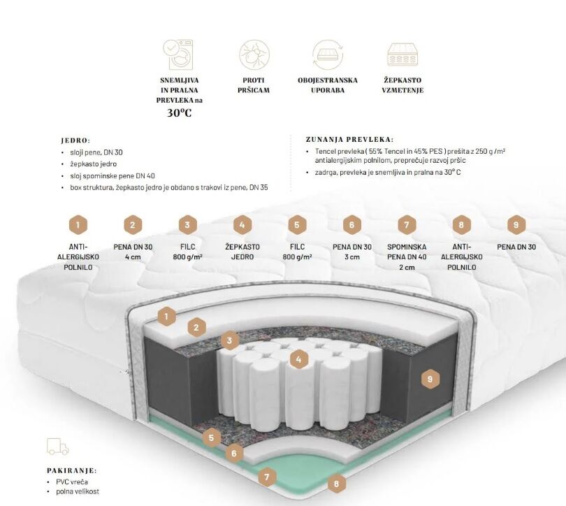 - ima po bočnih straneh vzmetnice 3D vstavek za maksimalno zračnost