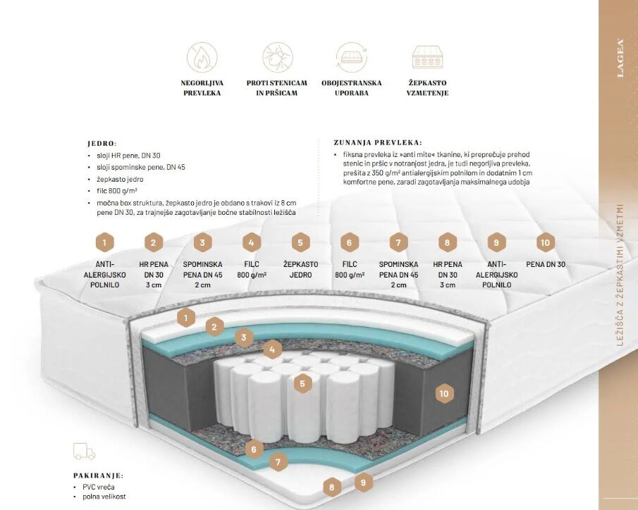 Vzmetnica Hotel 5 star je nastala za potrebe hotelskih nastanitev, s časom pa je našla svojo pot v številne slovenske domove in širše, ker ponuja srednjo trdoto in dobro ležalno udobje in je tako prepričala zelo široko populacijo ljudi, z različnimi spalnimi navadami. Hotel 5 star je ležišče iz žepkastih vzmeti, ki neodvisno reagirajo ena od druge. Na jedro je zaradi povečanega udobja na obeh straneh dodan 2 cm sloj spominske pene, s postavitvijo sloja spominske pene v globino jedra se preprečuje morebitno potenje pri ljudeh, ki so nagnjeni k temu, smo pa s tem ohranili vse pozitivne fizikalne lastnosti, ki jih takšna pena nudi. Vrhnji, ležalni sloj pa predstavlja hladno valjana / HR pena, ki ohranja svežino spalnega okolja. Vrhnja prevleka je fiksna in je mešanica bombažne in pes tkanine. Vzmetnica je spalna obojestransko. Z rednim obračanjem vzmetnice vertikalno in horizontalno, podaljšamo življenjsko dobo izdelka.