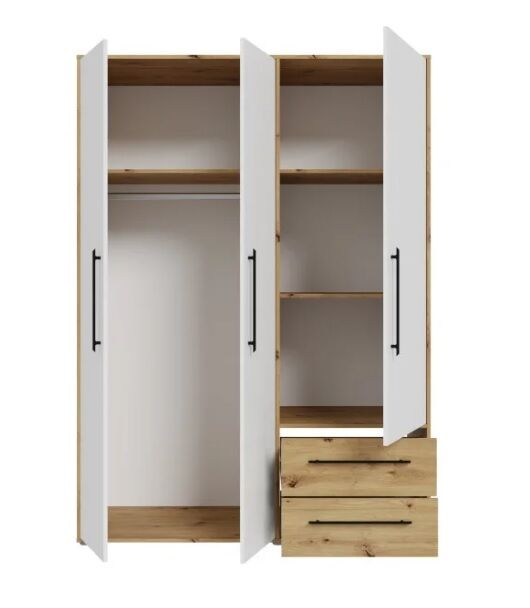 Ustvarite eleganten red z garderobo Mokkaris. Jasne linije, subtilne barve in elegantni kovinski ročaji v črni barvi poudarjajo brezčasen videz, ki se še posebej dobro ujema s trendovskimi koncepti opremljanja. Ta praktična in brezčasna omara vas bo navdušila.