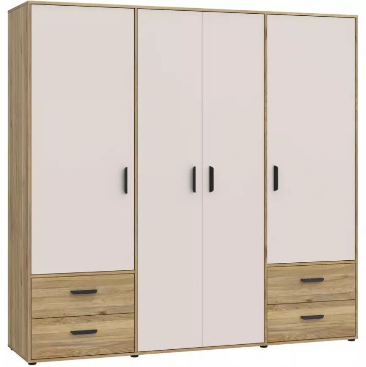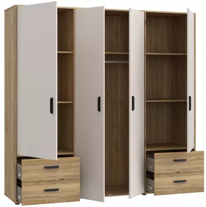 Ustvarite eleganten red z garderobo Mokkaro. Jasne linije, subtilne barve in elegantni ročaji v črni barvi poudarjajo brezčasen videz, ki se še posebej dobro ujema s trendovskimi koncepti opremljanja. Ta praktična in brezčasna omara vas bo navdušila.