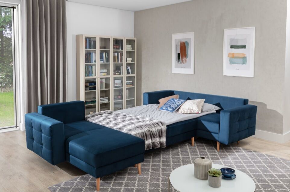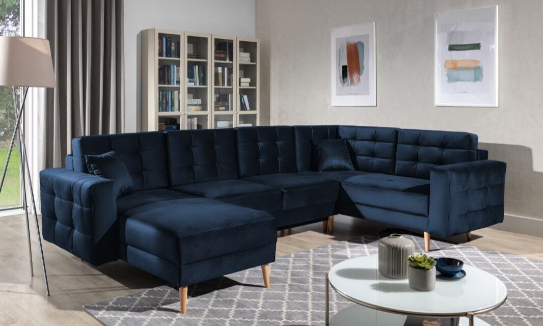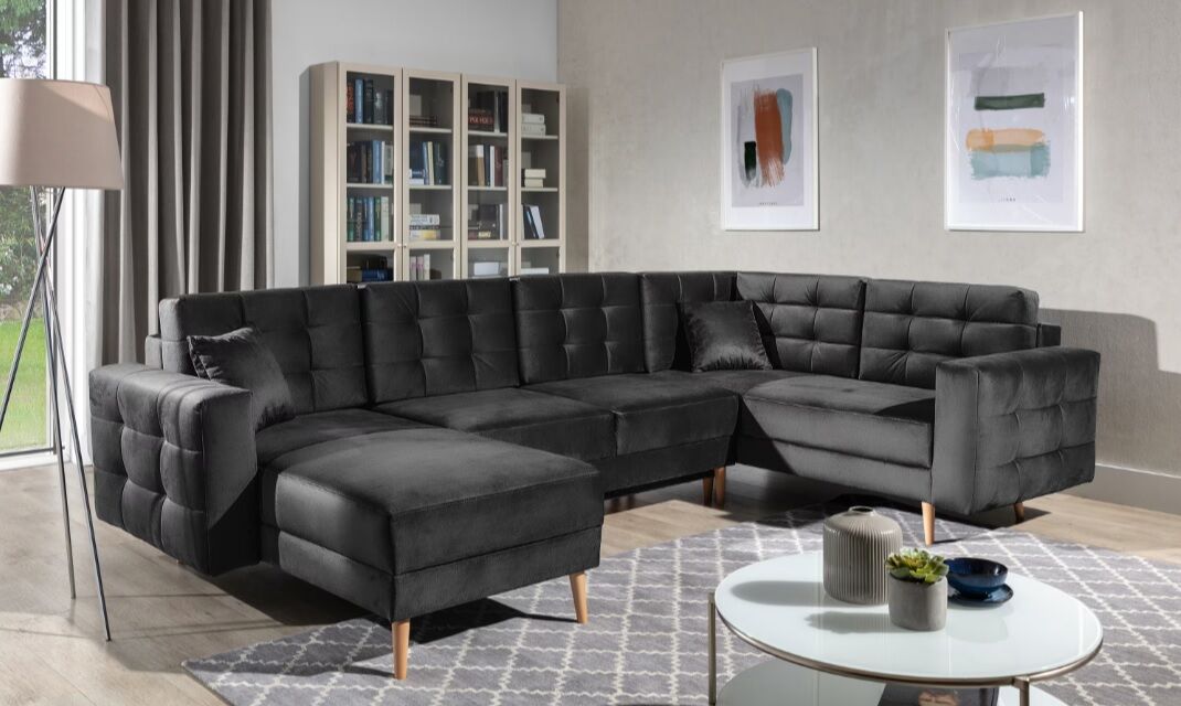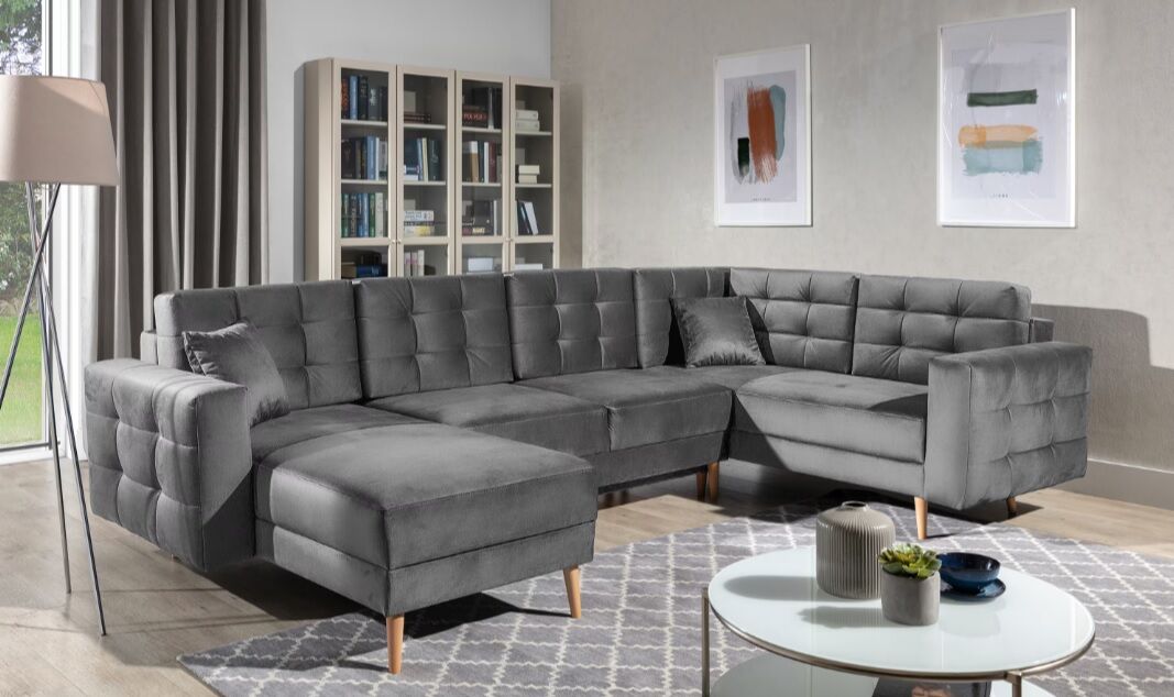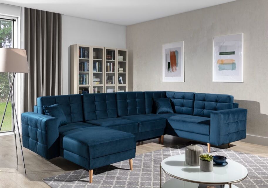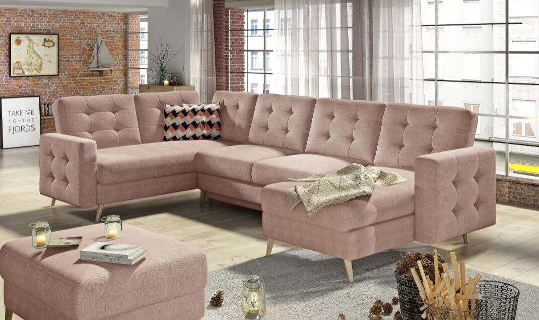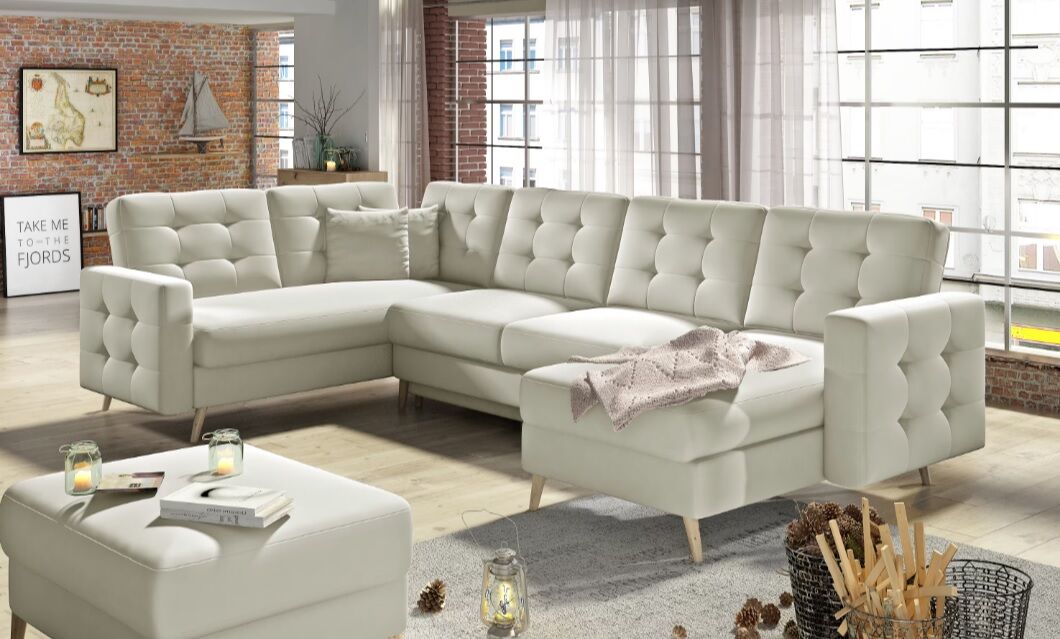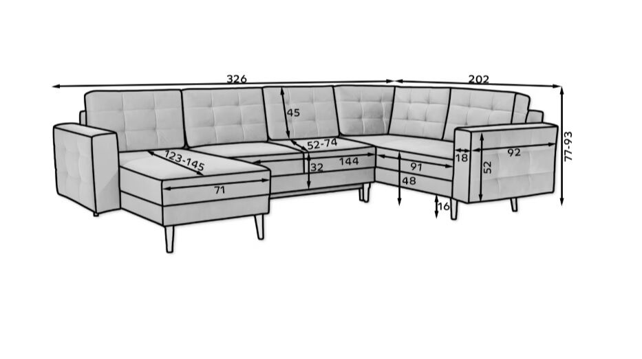 Asgard U je prostorna, udobna in oblazinjena kotna enota precejšnje velikosti z dimenzijami 326x202x93 cm. Kos pohištva v obliki črke U ima udobno, mehko sedišče iz trpežne valovite vzmeti in elastične pene T3030, ki je odporna na poškodbe. Naša kotna enota je opremljena s spalno funkcijo in prostornim predalom za shranjevanje posteljnine. Po razstavljanju pohištva z avtomatiziranim mehanizmom DL pridobimo 282 x 120 cm prostora za nočni počitek. Med značilne lastnosti kotne enote Asgard U spadajo: visok, 48 cm sedež, oblazinjeno naslonjalo, elegantno prešivanje in nežni šivi na hrbtni strani in straneh kotne enote. Poleg tega lahko naštejemo še: visoke, lesene, stružene noge ter množico razpoložljivih barvnih različic. Asgard U je sinonim za udobje in dober stil, ki se bo odlično podal v številne notranje prostore.