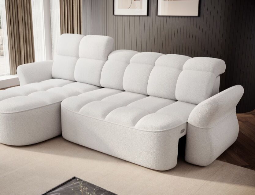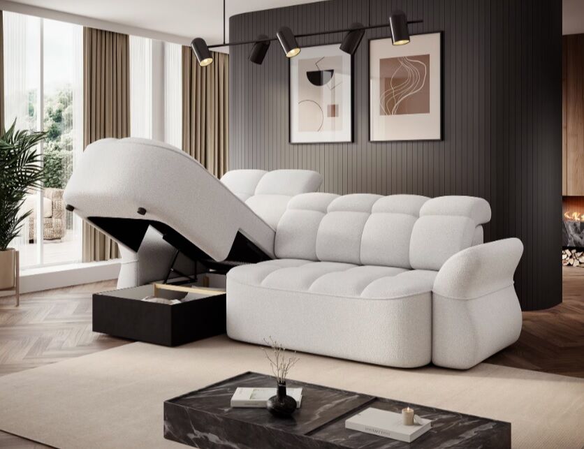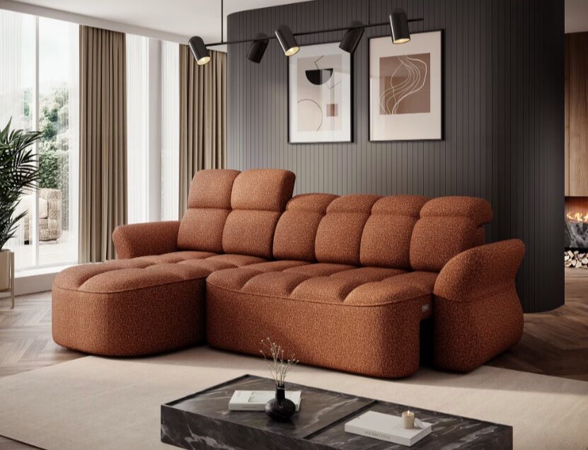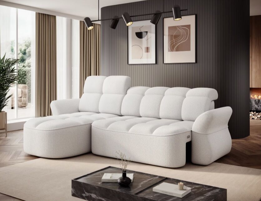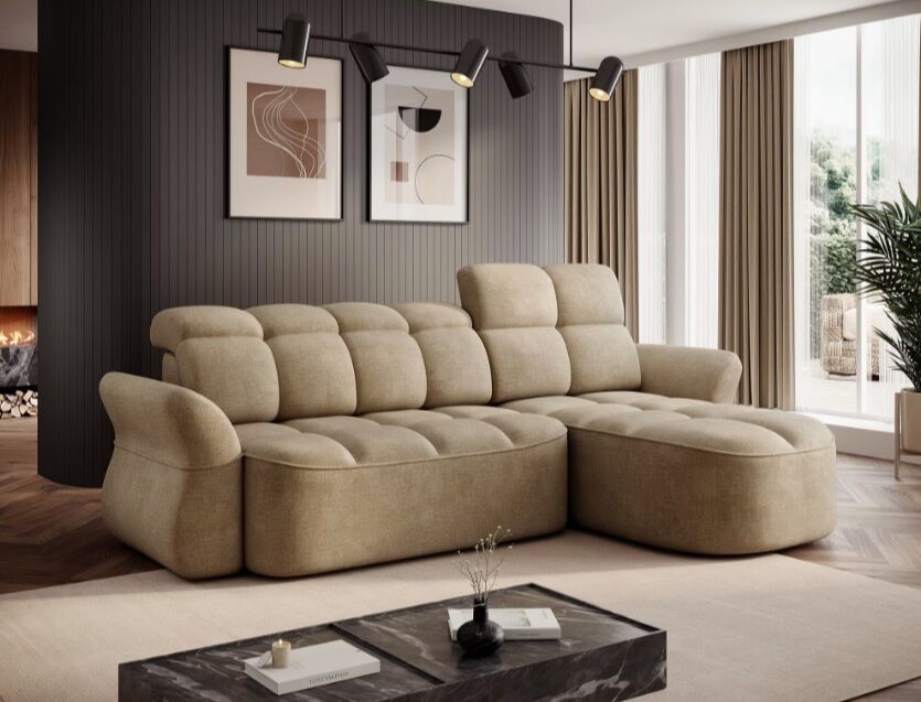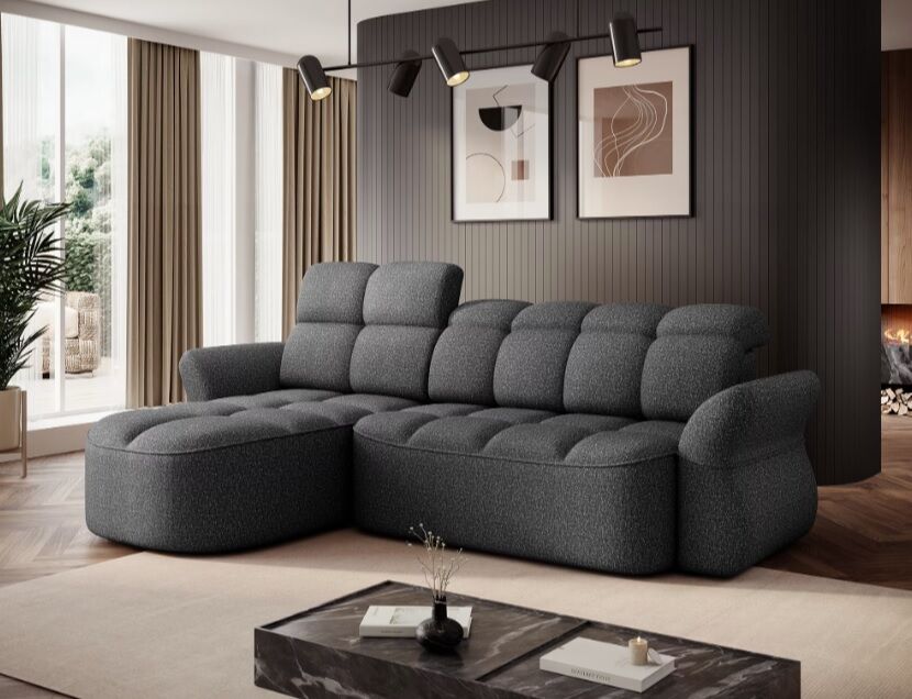 Kotna sedežna garnitura Beneth je popolna mešanica modernega dizajna in vrhunskega udobja. Njen prostoren sedež, polnjen z valovitimi vzmetmi tipa B in visoko odporno peno HR3030, ponuja idealno ravnovesje med mehkobo in oporo. Naslonjalo z oblazinjenim pasom in poliuretansko peno T2315 se prilagodi vaši drži za popolno sprostitev. Beneth pa ni le videz – poln je funkcionalnosti. Ima spalno funkcijo in predal za shranjevanje, električni podaljšek sedeža pa omogoča enostavno nastavitev globine. Popolnoma oblazinjeno naslonjalo ga naredi osupljiv osrednji del z vsakega kota, elegantne črne plastične noge pa dodajo pridih lahkotnosti in moderne elegance.