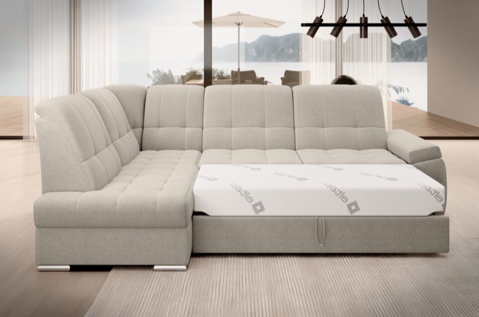 Kotna sedežna garnitura Sado z dimenzijami 272 x 192 x 95 cm je bila zasnovana za udoben počitek. Popolna je za gledanje filmov, idealna za branje knjig. To je zasluga profiliranega naslonjala z možnostjo nastavitve. Pohištvo je opremljeno tudi z zložljivo funkcijo spanja s površino 207 x 130 cm, tako da lahko Sado po potrebi enostavno spremenite v dodatno ležišče. Druga prednost kotne sedežne garniture je zelo preprost in intuitiven mehanizem delfin, ki se uporablja pri zlaganju tega kosa pohištva. Poleg tega lahko predal, ki se nahaja v tabureju, zlahka sprejme posteljnino. Popolno shranjevanje za ljudi, ki cenijo prostor! Omeniti velja tudi udoben, profiliran naslon za roke in elegantne, posrebrene lesene noge, ki se bodo odlično podale v sodobne dnevne sobe.