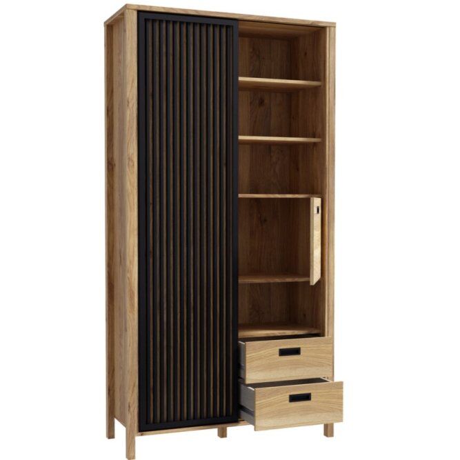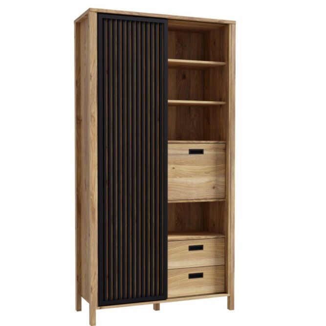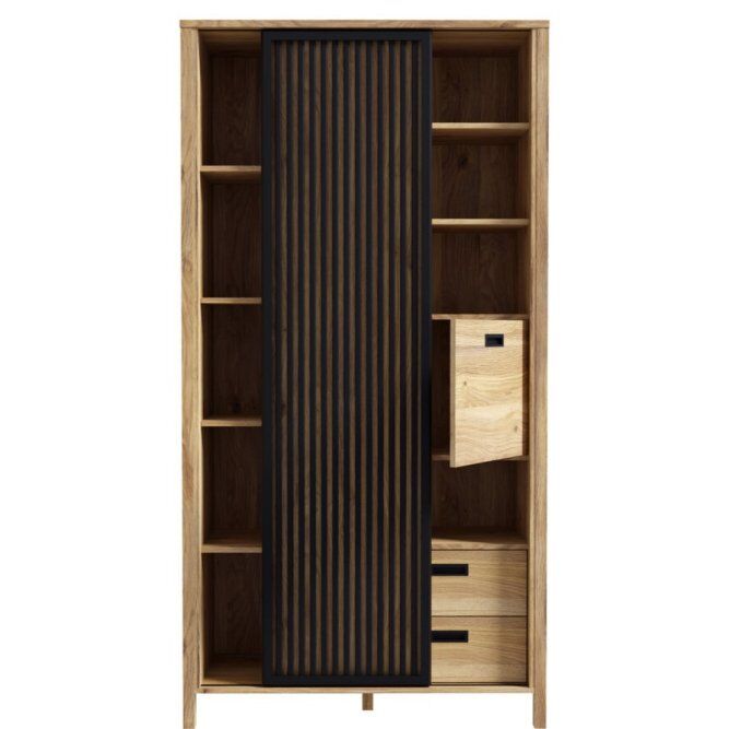 Vitrina JYTANA je še posebej priporočljiva za dnevne sobe, opremljene v modernem slogu. Ima 4 odprte predale, 1 zaprto omarico in 2 predala, nameščena na vodilih s polnim izvlekom. Za drsnimi vrati s črnimi letvicami boste našli 5 predal, ki zagotavljajo dovolj prostora za shranjevanje knjig, CD-jev/DVD-jev, spominkov ali najljubših okraskov.