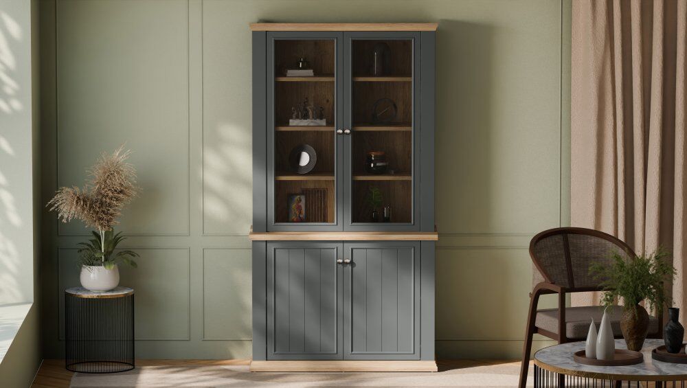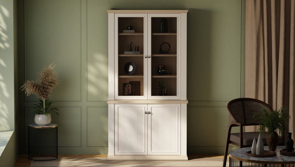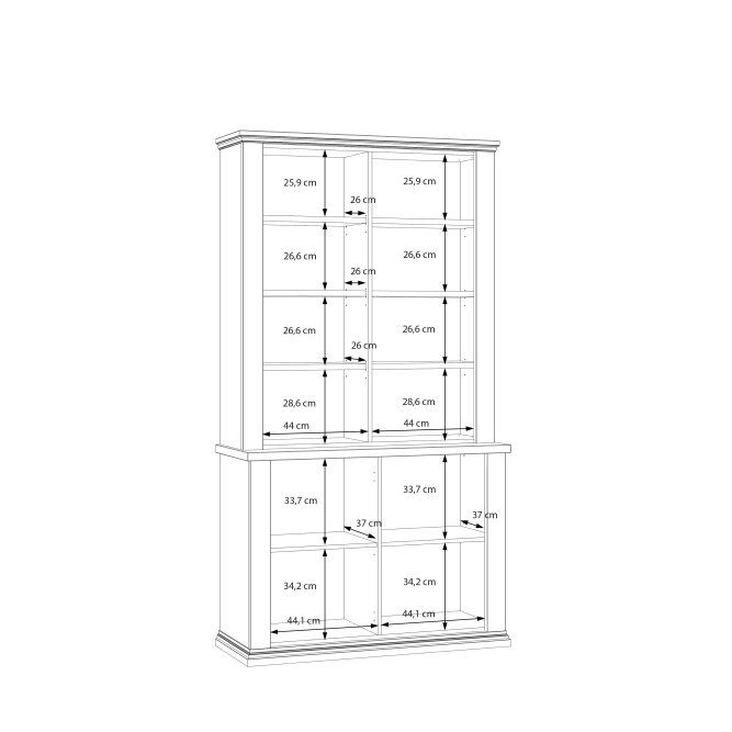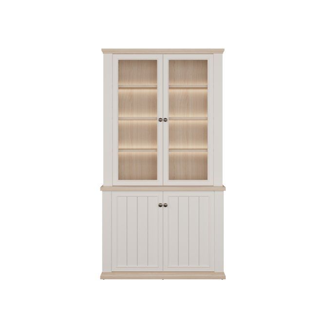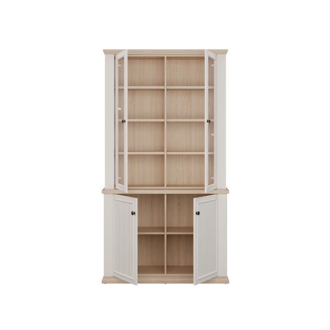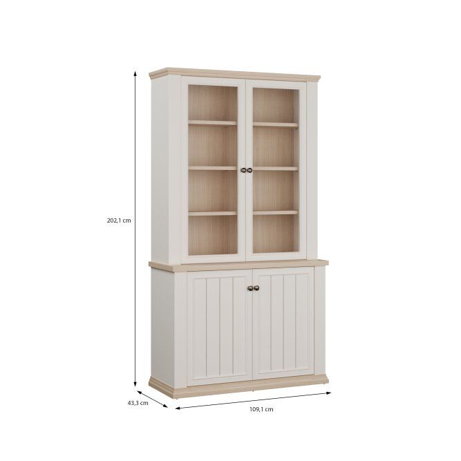 Ta skoraj 110 cm široka vitrina bo odlično razstavila vaše najljubše knjige, spominke in okraske. Osem nastavljivih polic in dve fiksni polici to omogoča. Omarica je opremljena s prozornim, kaljenim varnostnim steklom. Vitrina s 4 vrati izgleda odlično v kombinaciji z drugimi kosi iz kolekcije in ustvarja sanjsko zasnovo dnevne sobe.