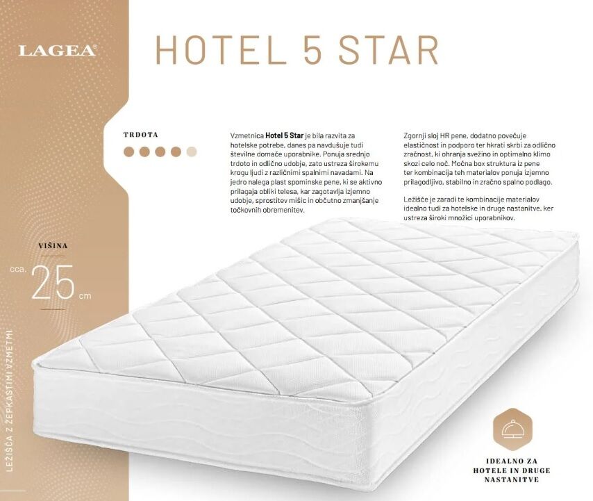 Vzmetnica Hotel 5 star je nastala za potrebe hotelskih nastanitev, s časom pa je našla svojo pot v številne slovenske domove in širše, ker ponuja srednjo trdoto in dobro ležalno udobje in je tako prepričala zelo široko populacijo ljudi, z različnimi spalnimi navadami. Hotel 5 star je ležišče iz žepkastih vzmeti, ki neodvisno reagirajo ena od druge. Na jedro je zaradi povečanega udobja na obeh straneh dodan 2 cm sloj spominske pene, s postavitvijo sloja spominske pene v globino jedra se preprečuje morebitno potenje pri ljudeh, ki so nagnjeni k temu, smo pa s tem ohranili vse pozitivne fizikalne lastnosti, ki jih takšna pena nudi. Vrhnji, ležalni sloj pa predstavlja hladno valjana / HR pena, ki ohranja svežino spalnega okolja. Vrhnja prevleka je fiksna in je mešanica bombažne in pes tkanine. Vzmetnica je spalna obojestransko. Z rednim obračanjem vzmetnice vertikalno in horizontalno, podaljšamo življenjsko dobo izdelka.